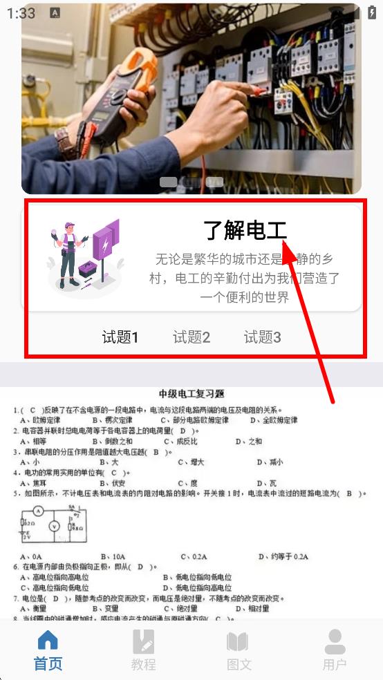 1在首页可以查看电工相关的介绍内容,也能完成试题1、试题2、试题3等练习题。