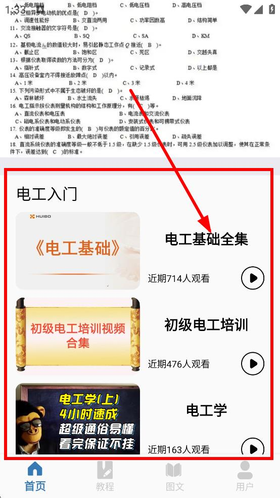 1知识获取不再受时空束缚,无论是通勤间隙、午休片刻,都能通过视频讲解、图文资料与习题训练等多元形式,将碎片化时间转化为高效的电工知识积累过程,让学习节奏完全由自己掌控。