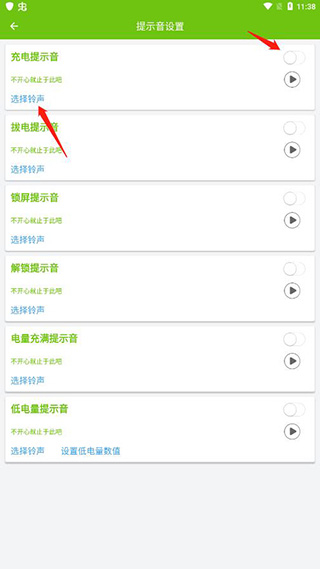 6挑选你想要启用的提示音效,像充电时的提示音这类,直接选择对应的铃声即可。