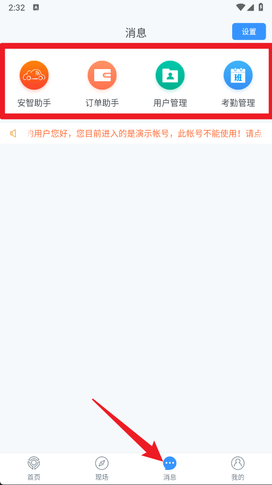5、借助消息功能,用户能够查看安智助手、订单助手、用户管理以及考勤管理方面的相关通知,从而及时了解系统的动态信息。