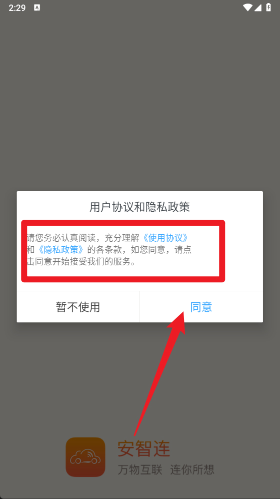 1、首次打开安智连应用,会弹出《用户协议》的提示窗口,用户需要仔细阅读协议内容,然后点击同意按钮,才能继续使用应用的各项功能。