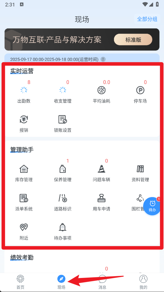 4、进入现场页面后,能够查看出勤数等实时运营数据,还可以借助管理助手开展库存管理、保养申请等相关操作。