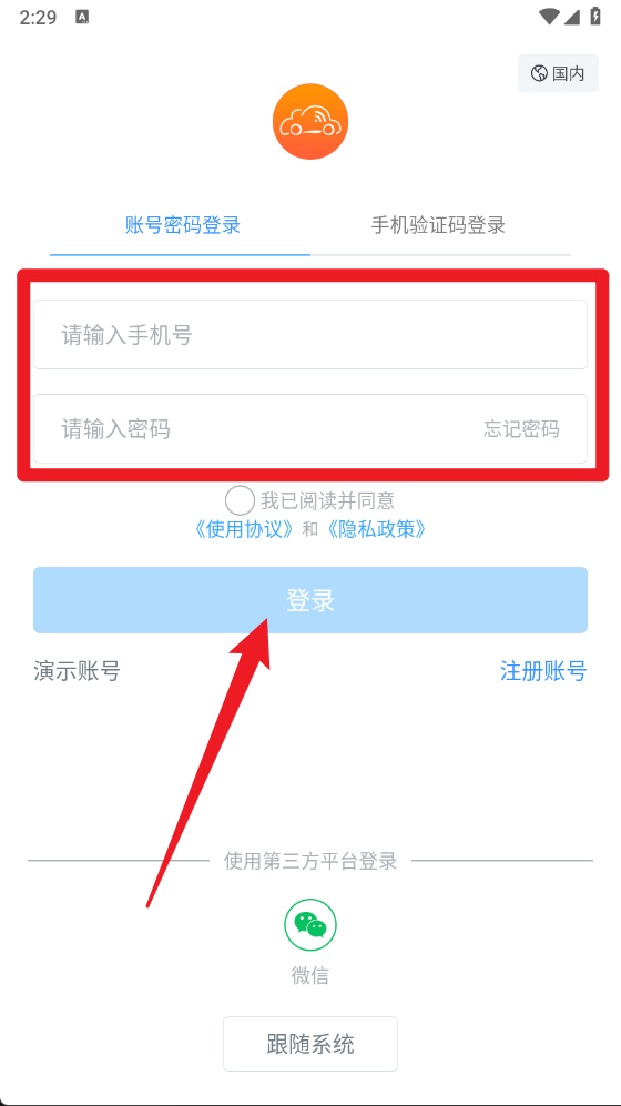 2、进入登录页面后,可选择输入手机号与密码登录,也能通过手机验证码实现快捷登录,操作时需勾选同意协议内容,再点击登录按钮。