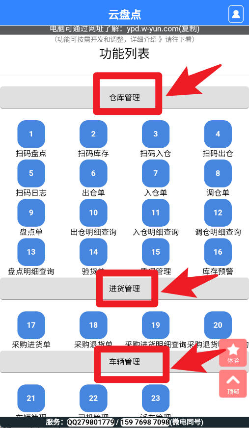 3、功能列表涵盖仓库管理、进货管理、车辆管理等,点击相应模块即可进行扫码盘点、出入库单管理和库存查询。