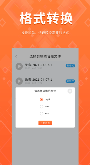 4、格式转换 支持音频格式转换,可以将语音转换成wav、map等常见的音频格式,还可以进行音频剪辑、音频分段、音频剪辑和音频修改,并且会在语音中加入背景音乐。