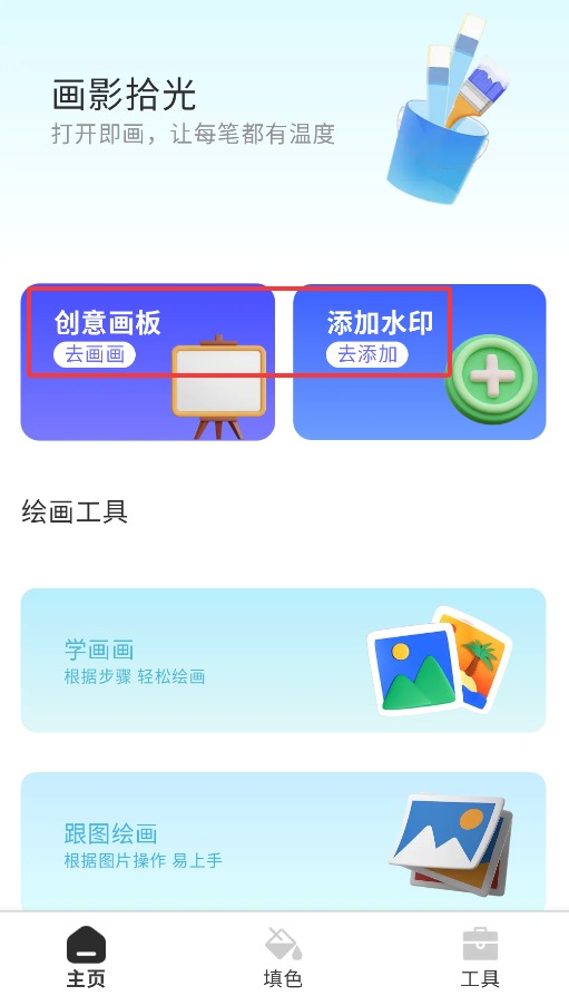 2、主页提供创意画板与水印添加功能,支持自由创作与图片个性化标记。