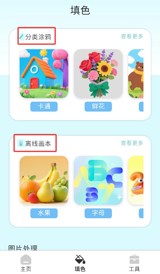 3、填色板块可选卡通、鲜花等分类涂鸦,离线画本含水果、字母等主题模板。