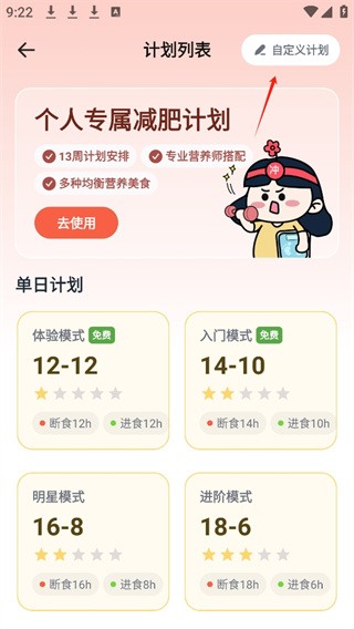 用户能够自行设定断食与进食的时间段,也可以自由搭配食谱,从而生成多种不同的计划方案。