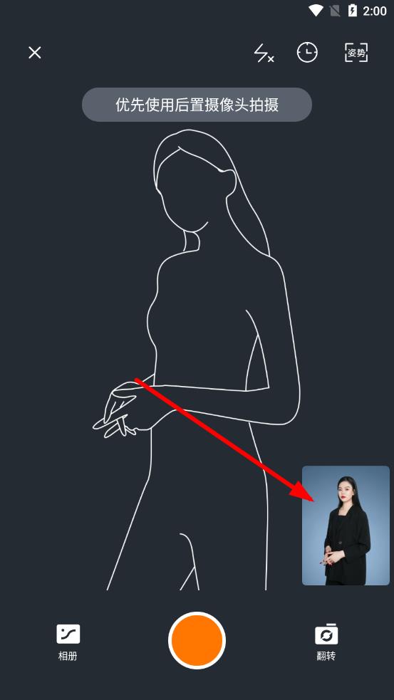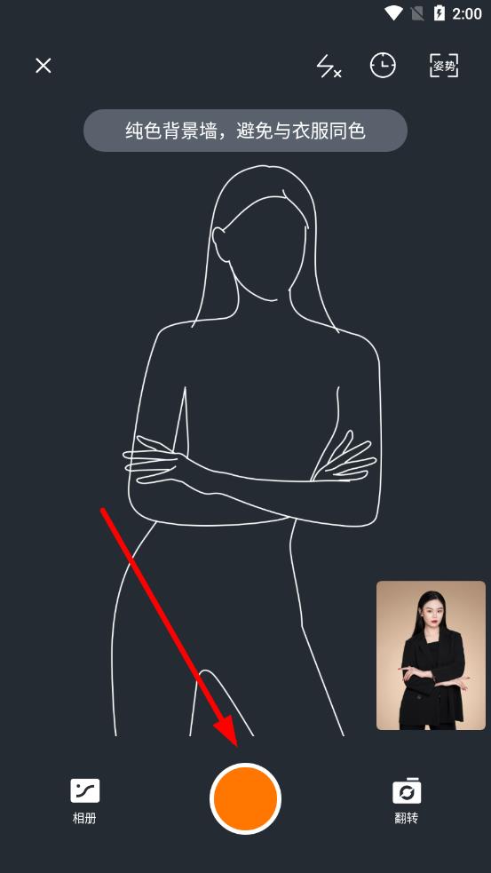 4、在按照选定的姿势线条图调整好自身姿势后,点击界面下方的橙色拍照按钮,完成照片拍摄。