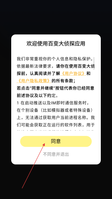 1、在欢迎弹窗中点击【同意】按钮,以接受《用户协议》和《用户隐私政策》。