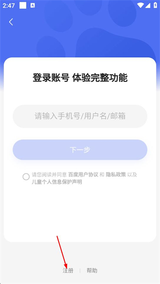 3、在登录账号页面,点击注册选项,进入注册页面。