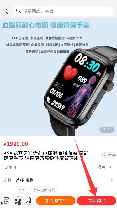 4、进入商品详细信息界面后,点击页面右下角立即购买选择规格后付款完成下单。