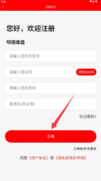 1、在注册界面输入手机号和短信验证码,设置登录密码后点击注册完成创建。