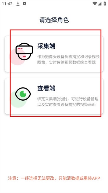 1、在两部手机上同时安装本应用,一部设为【采集端】来充当摄像头,另一部作为【查看端】通过扫码绑定【采集端】,以下操作以采集端为例进行说明