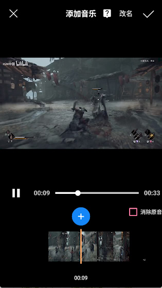 3、点击+号添加音乐,可勾选消除原音选项,操作完成后点击右上角的按钮进行保存