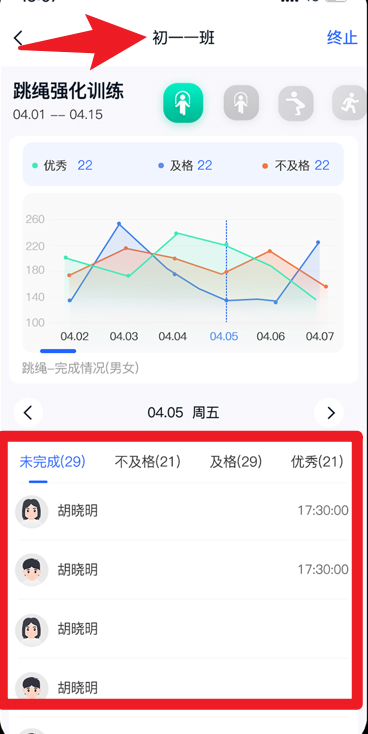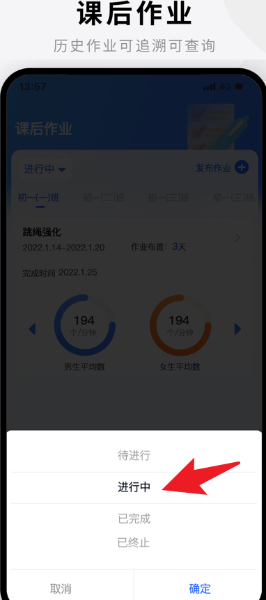 2、在作业状态界面,教师可实时查看作业的各项进展情况,如待进行、进行中、已完成、已终止等状态,从而清晰掌握学生的作业完成度。