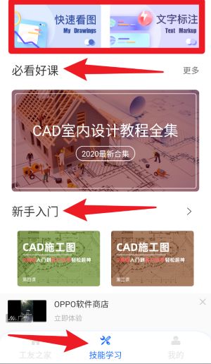 5、切换至底部的技能学习栏,能找到必看好课与新手入门专题,适合CAD等技能学习的初学者快速掌握。