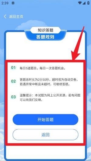 2、进入答题规则页面后,每天能参与一次知识答题,答题限时2分30秒,完成答题有助于巩固所学内容。