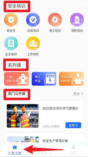 1、在工友之家页面里,能够进入各类安全培训模块,其中涵盖电工培训、消防培训、注安培训等专业课程内容。