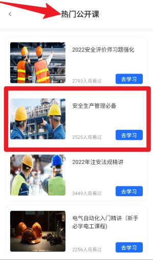 4、在热门公开课页面,你可以挑选像安全生产管理必备这类热门课程,点击“去学习”按钮就能马上开始学习。