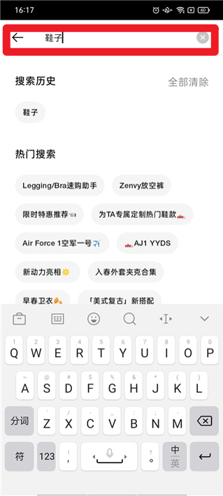 2、在搜索界面中输入鞋子或其他关键词,系统会自动显示相关商品和热门推荐,用户可以根据需求选择心仪的运动鞋服,操作直观便捷。