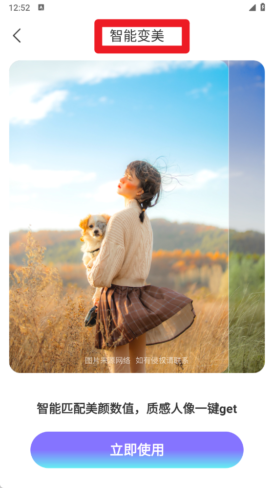 4、在智能变美界面,用户只需一键启动美颜优化功能,系统便会自动适配最优美颜参数,使人像照片的质感即刻得到提升,从而轻松收获理想的美化效果。