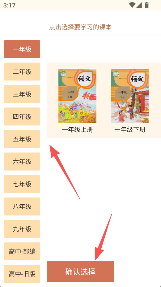 1、进入首页后,选择对应的年级和课本,再点击“确认选择”按钮。