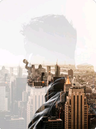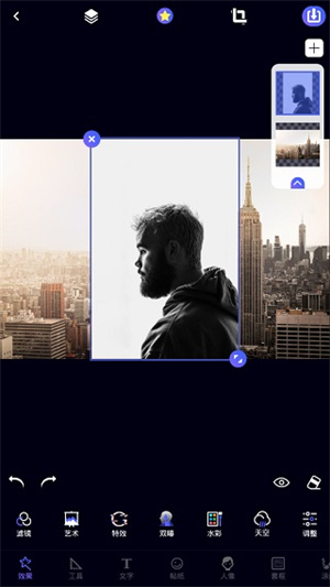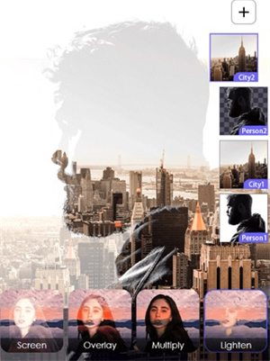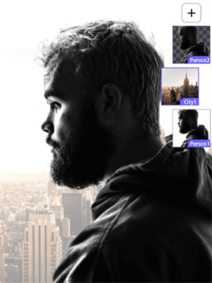 2、首先添加两张照片,将人物照片设为底图,城市照片作为混合素材。