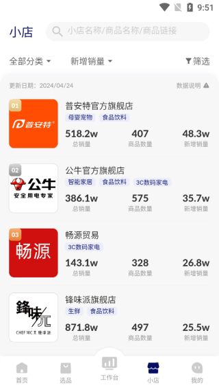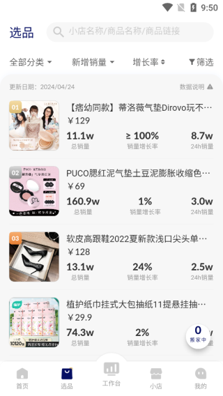 3、选品专区支持查看各类商品的销量增长率,助力用户把握市场动态
