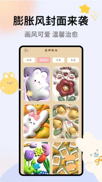 这里的膨胀风封面能在线呈现可爱画风,为用户带来温馨的治愈感。