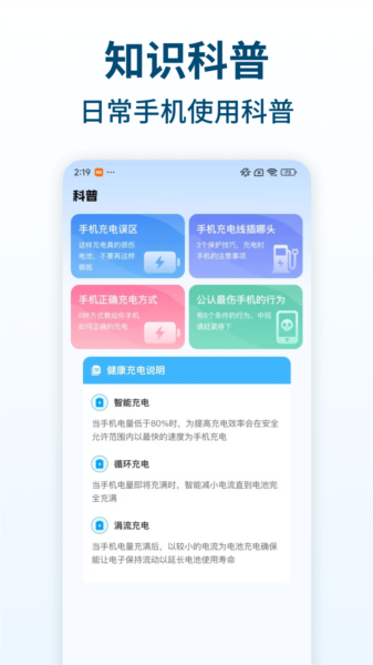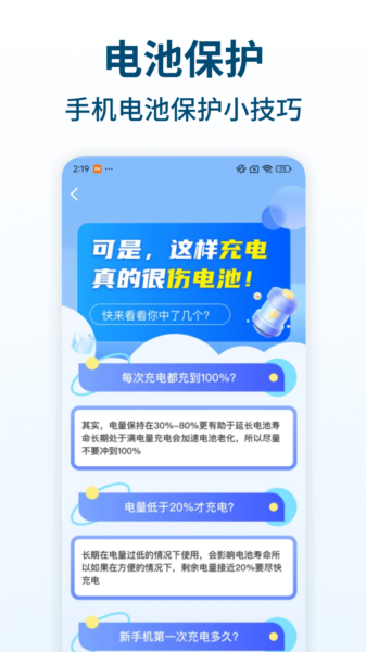 3、你能够在本应用里了解电池寿命相关的使用小技巧,还有关于如何安全充电的小知识。