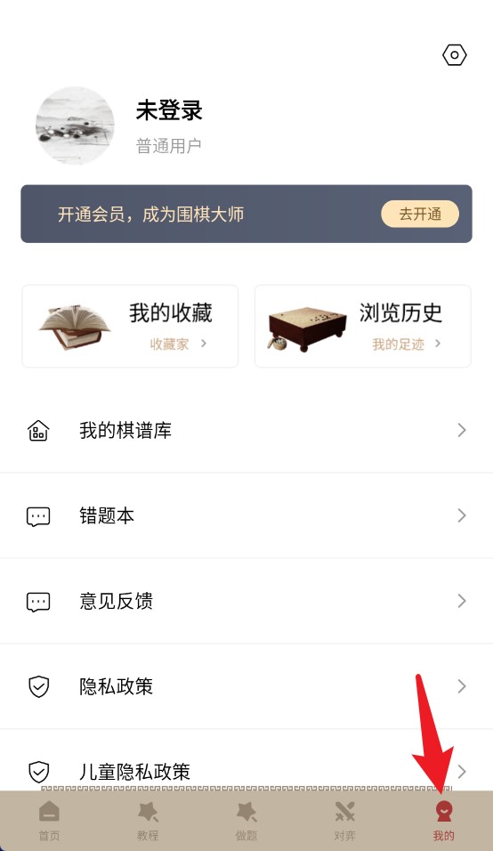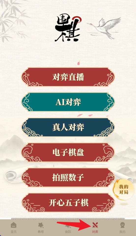 1、在首页的功能区域,能看到真人对弈、AI对弈、专项练习以及拍照数子等主要功能的入口。
