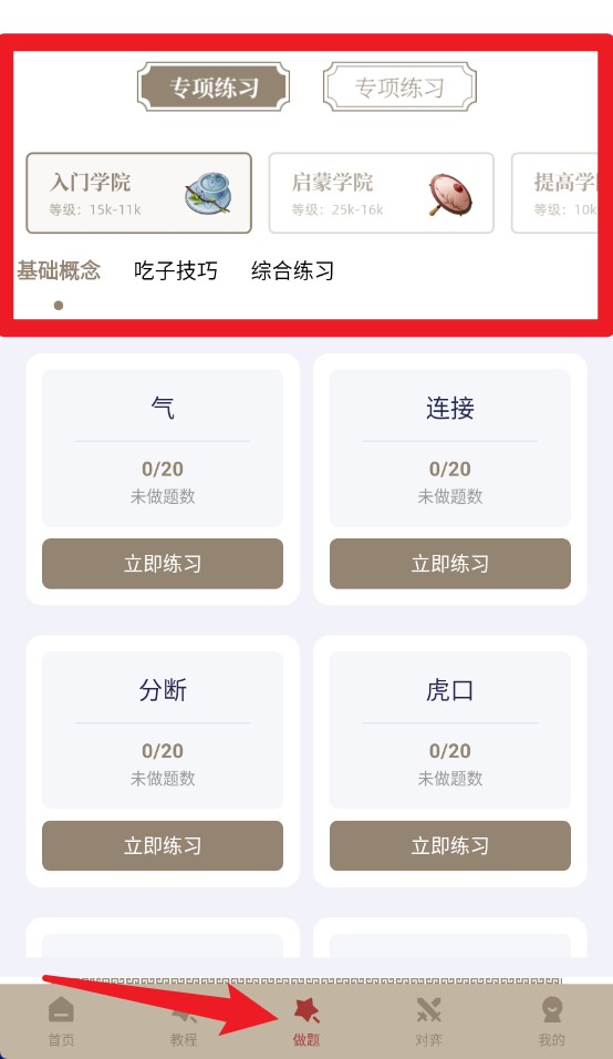 3、在做题页面,用户可根据等级选择对应学院,开展气、连接、分断等围棋专项训练题目练习。