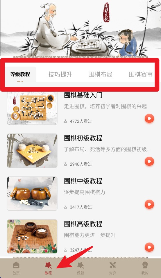2、点击教程标签后,能够按照顺序学习围棋基础、初级、中级以及高级等进阶课程内容。