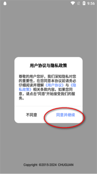 2、初次进入软件需要同意并继续用户协议与隐私政策。