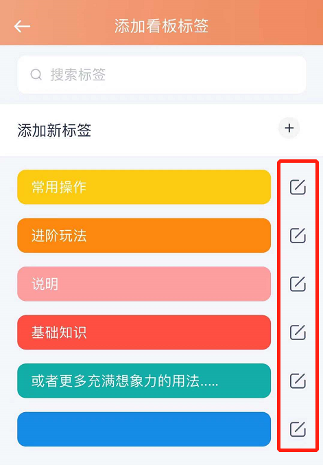 标签能够贴在看板内的任意一张卡片上,使关键信息更加突出。在看板的设置界面中开启「标签管理」功能,就可以对标签进行编辑和删除操作。