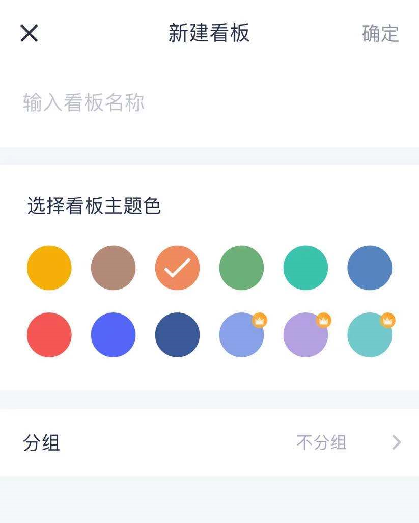 2)创建新看板时,需要为其命名并挑选主题色;主题色能够用于区分看板的属性(例如:黄色可表示适用于团队、蓝色可表示适用于个人、绿色可表示适用于生活等)。