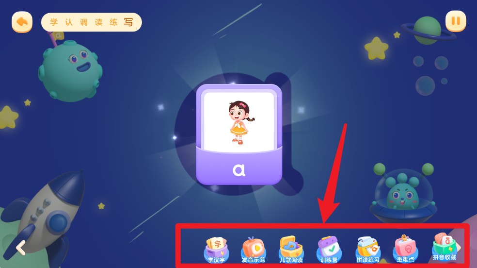 1、在首页的功能区域,能够看到学、认、调、读、练、写这六大模块,它们涵盖了拼音学习的整个过程。