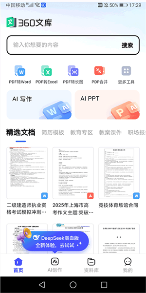 360文库是一款可以满足你工作学习全场景的工具软件,软件不仅可以帮助你教育备考、职场办公、还可以帮助你创意创作,制作自己喜欢的东西,真题试卷、行业报告随你使用,只需要输入主题就可以获取框架,帮助你生成文档!
