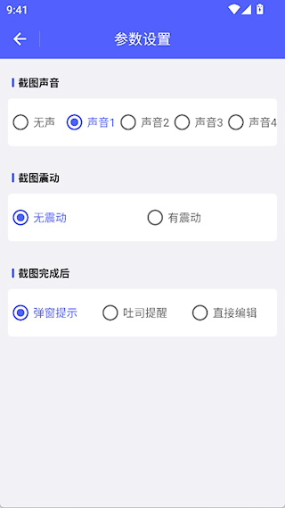 2、点击右上角按钮,能设置截图声音、震动和提示