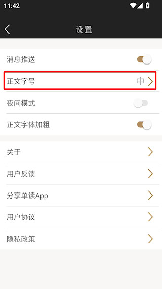 3、于设置菜单中找到"正文字号"选项,点击后可根据阅读习惯选择适合的字体大小。