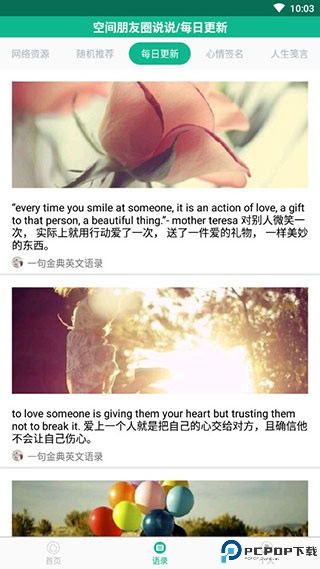 3、励志演讲板块配备海量励志语句库,每日持续更新经典名言与最新摘录内容。该功能支持关键词搜索与随机推荐两种模式,用户不仅能收藏心仪金句,还可生成个性化分享图片以便传播。