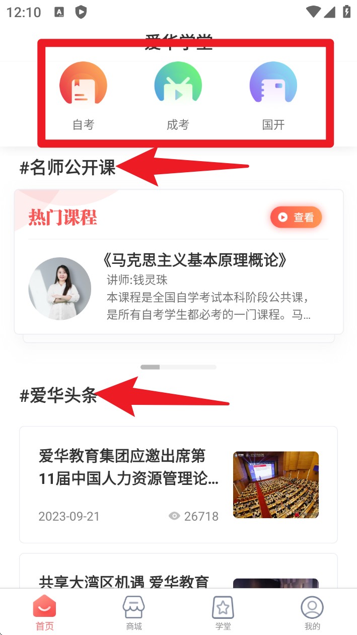 3. 返回首页上方可切换自考、成考、国开三类课程专区,点击后可进入对应课程模块浏览相关内容。