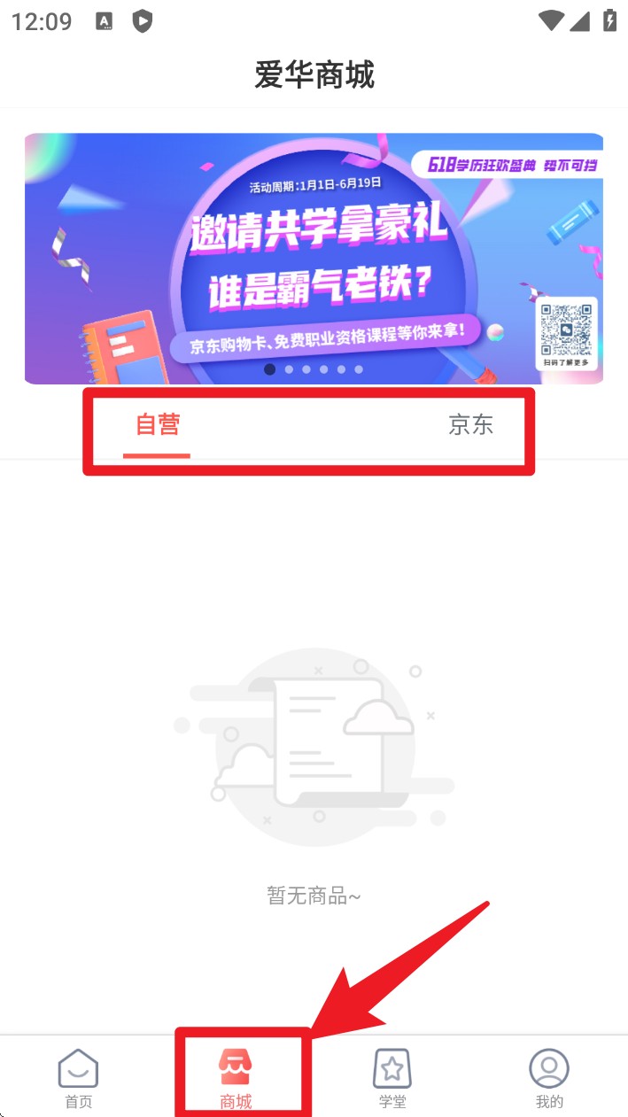 2. 登录成功后,点击底部商城按钮,进入可浏览京东和自营商品页面,当前暂未上架商品时会显示空页面提示。
