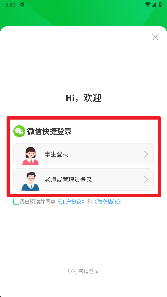 2、支持学生登录和教师或管理员登录,可选择微信快捷登录或账号密码登录,根据身份进入平台。
