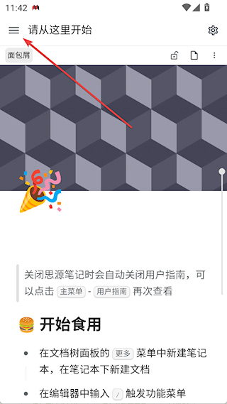 1、打开思源笔记,点击左上角三横按钮