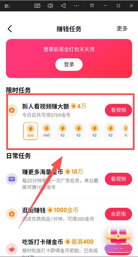 每天进入 “赚钱” 板块,完成里面的各类任务(看视频、逛商城等)来积累金币。