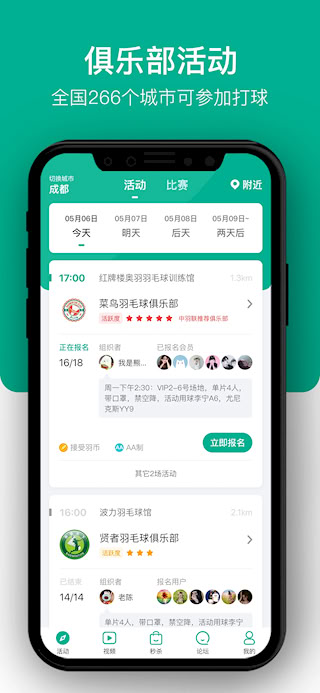 1、本地活动匹配系统:基于地理位置推荐附近的羽毛球活动,并能智能匹配与用户水平相近的参与者
