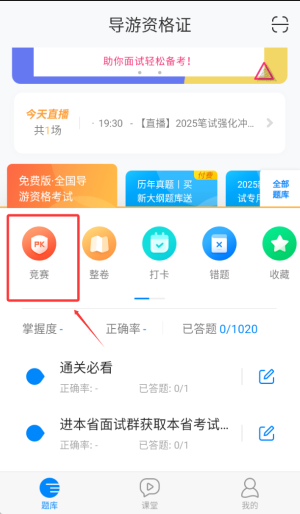 2、主功能区设有导游执业资格认证专项竞赛模块,能借助模拟实战检测知识掌握情况,进而提高应试能力。