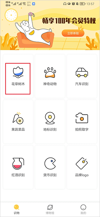 1、打开拍照识物 ,进入识物界面后,根据需求选择对应识别功能,例如花草识别、动物识别等。